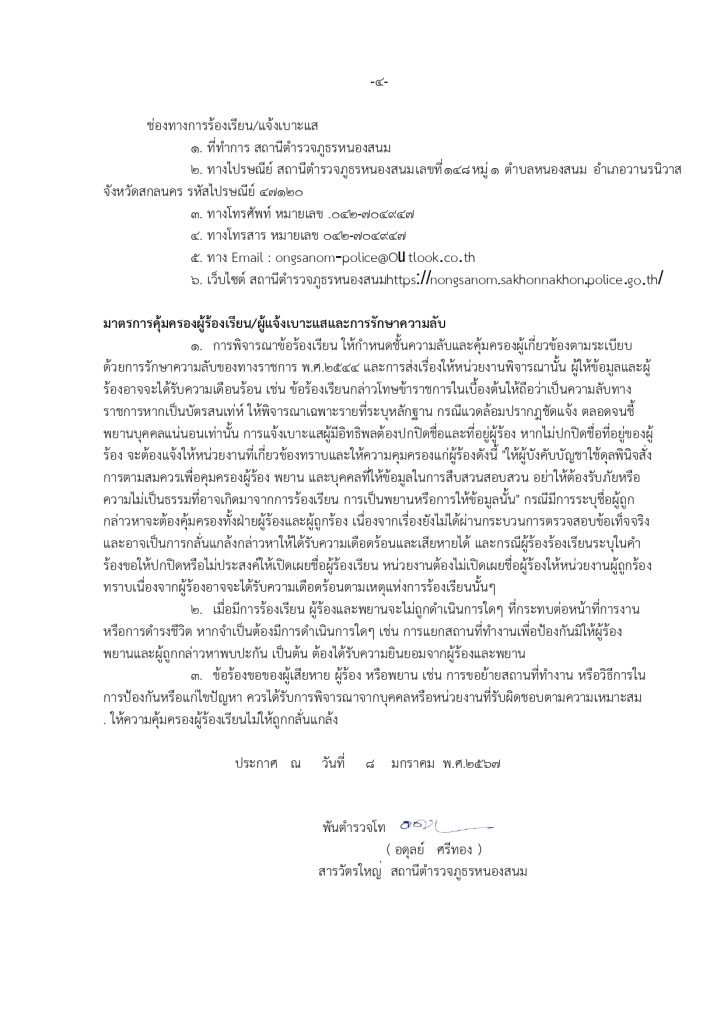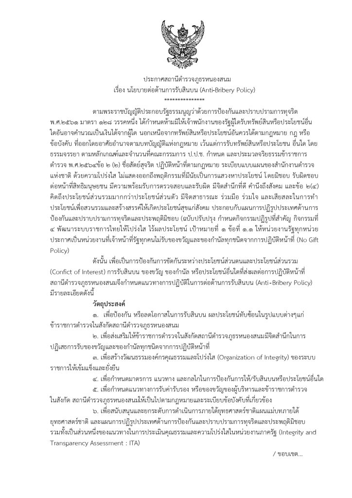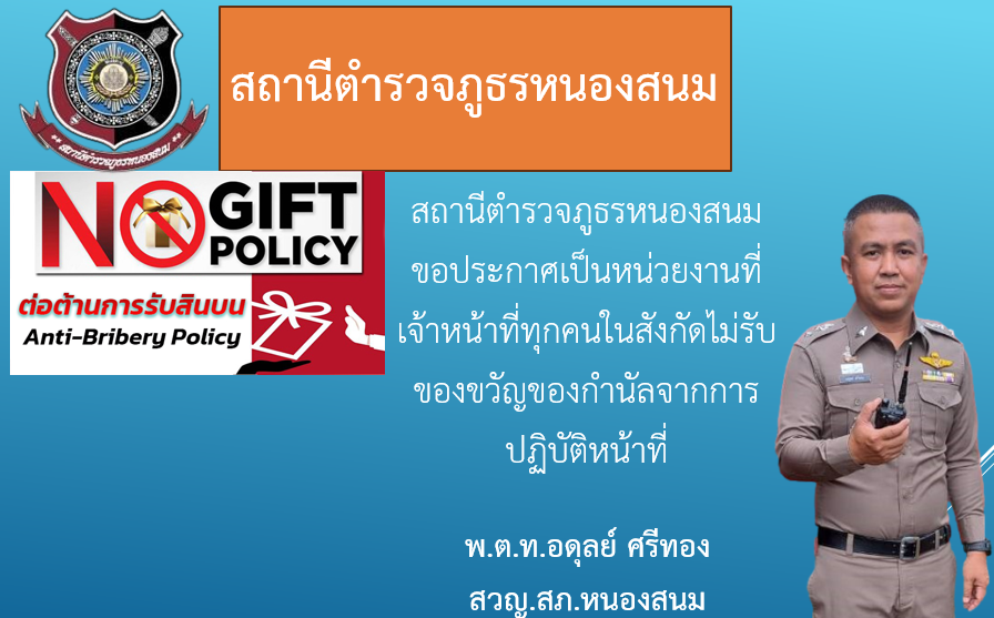 สภ.หนองสนม โดย พ.ต.ท.อดุลย์ ศรีทอง สวญ.สภ.หนองสนม ขอประกาศนโยบาย No Gift Policy “งดให้ งดรับ” สินบน ของขวัญ ของกำนัล หรือสินน้ำใจ จากการปฏิบัติหน้าที่ เพื่อเสริมสร้างวัฒนธรรมการทำงานอย่างโปร่งใส